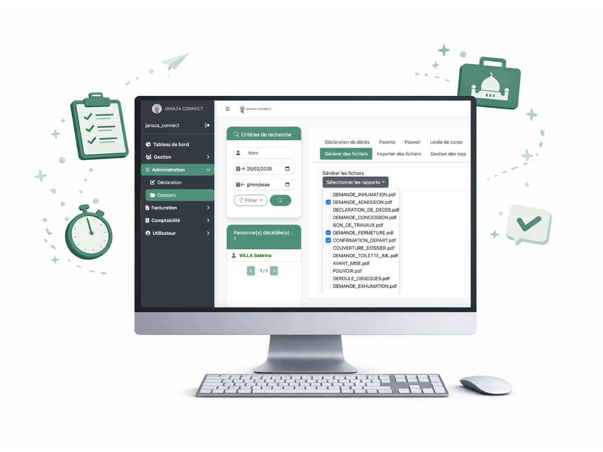 Tout votre travail centralisé sur une seule plateforme. Imprimez, téléchargez et envoyez vos documents directement via Janaza Connect.